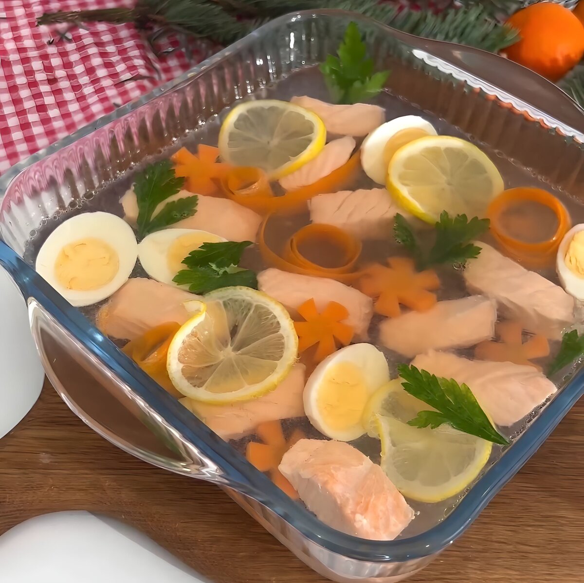 Берем кастрюлю и добавляем в нее воды, ставим все на огонь и, по сути, готовим бульон. Обязательно солим, перчим и добавляем лавровый лист. Доводим все до кипения, а пока подготавливаем морковь и рыбу, которые нарезаем так, как душе угодно. Отправляем всю нарезку в воду и варим примерно 10 минут, а рыбу до готовности . Параллельно отвариваем яйца. И, как только бульон готов, можно собирать само заливное. Для начала процеживаем всю воду, но не выливаем ее. На блюдо, обязательно с высокими бортикам