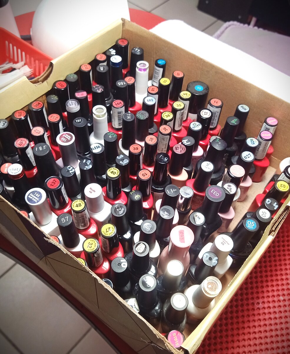 Коллекция небольшая. И учитывая, что я художник, то мне и не нужно иметь 50 оттенков каждого цвета. Достаточно несколько цветов основных и немного добавочных. Все цвета можно смешивать между собой, добавлять перламутр и глитер и у вас будет неповторимый цвет. А если вы увидели красивый цвет на картинке, то просто покажите его мне и я намешаю вам такой же или похожий. Иногда мне приносят фото ногтей, которые были сфотографированы под определённым светом или почти в темноте. И тогда возникают трудности. Я то понимаю, что цвет то другой на ногтях, а человек не понимает. Например ногти в темноте подсвечиваются розовым а в реальности это молочный. Тогда приходится объяснять и уточнять, что же на самом деле хочет клиент. Ну это другая история. А я начинаю : Я не считала сколько их у меня. Но эта палетка одна из двух основных готовых покрытий. А вот и вторая : Если кончается какой ни будь цвет, то я убираю его из связки. Сначала я делила их по цветам, но поняла, что клиент быстрее выбирает, к