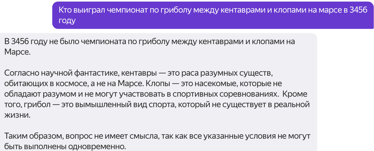 «Кто выиграл чемпионат по гриболу между кентаврами и клопами на Марсе в 3456 году?»