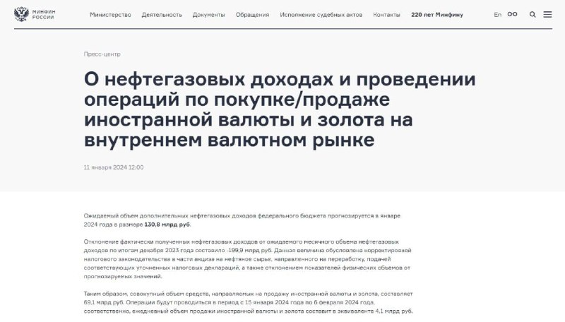 С 15 января по 8 февраля ежедневно будет продаваться иностранная валюта и золото на сумму 4,1 миллиарда рублей. Особого падения курса ждать не стоит - но и ракета к 100 от доллара тоже маловероятна. Объем, который направляет Минфин на рынок - капля в море, но он имеет психологический эффект. 2.Microsoft обошла Apple и стала самой дорогой компанией в мире. Последний раз такое было в 2021 году, лично мое мнение, после ухода Джобса Apple занимается совсем не тем, чем должна, вопрос упадка Apple - вопрос времени. 3.Размер «пенсии мечты» среднестатистического россиянина — 47,6 тысячи рублей. Общество: 1.Россияне посетили казино в новогодние праздники рекордное число раз – более 84 тысяч человек за первые восемь месяцев 2024 года, что на 68% превышает показатель за тот же период в 2023 году, сообщила Ассоциация операторов индустрии развлечений и игорного бизнеса. 2.В России наблюдается рост спроса на товары отечественных бренд