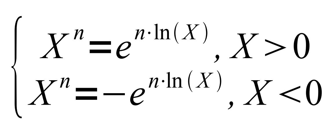 Эту же формулу можно использовать для возведения X в дробную степень n, где n – обыкновенная правильная дробь вида k/l, а знаменатель l - нечётное число. Если знаменатель l - четное число, то это означает извлечение корня четной степени. В этом случае есть ограничения на выполнение операции: подкоренное выражение не должно быть отрицательным.