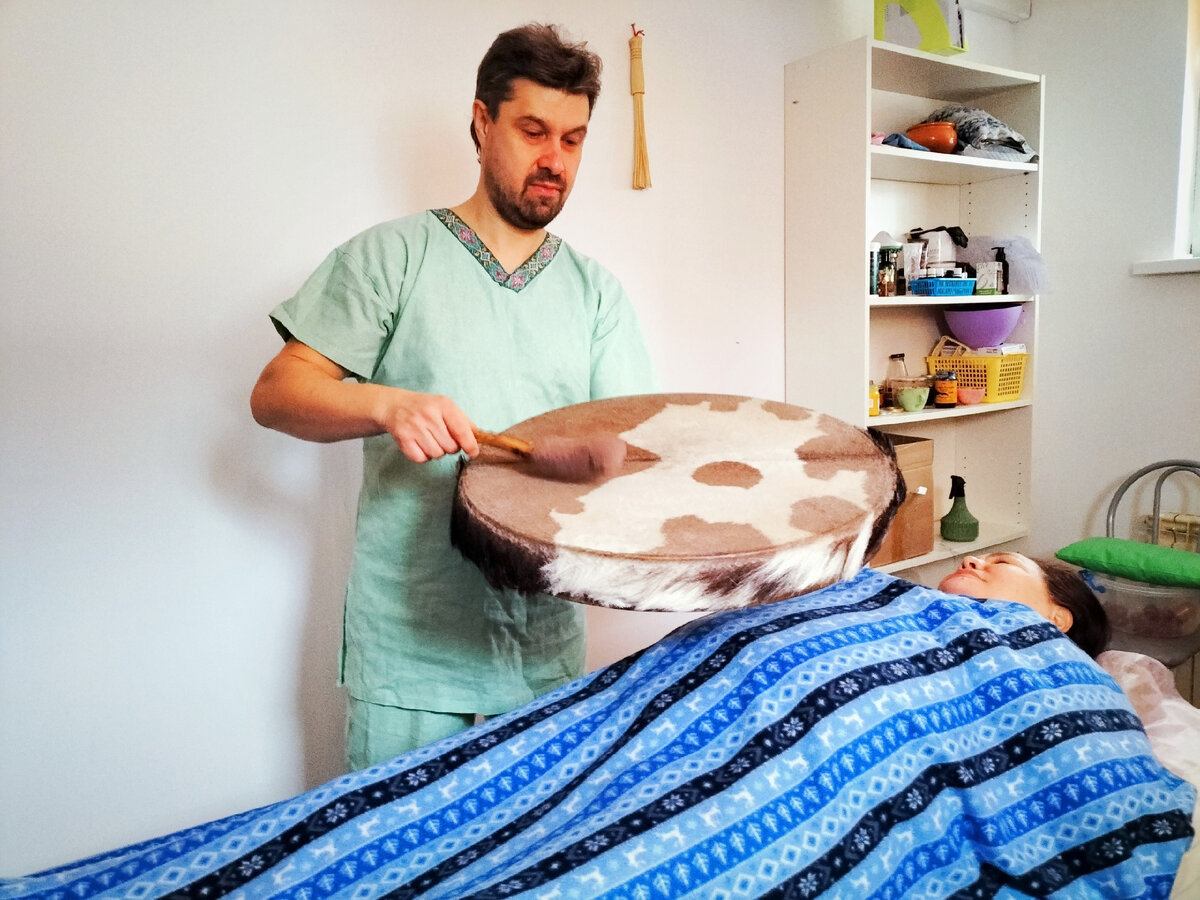 В своей массажной деятельности довольно эффективным нашёл применение одновременно использовать вибрационно-акустический массажи и традиционный. Массаж бубном и поющей чашей предварительно действует расслабляюще, снимает блоки, происходит настройка человека на дальнейшую работу традиционными методами. Если ещё дополнить массаж бамбуковыми вениками, то это вообще замечательно. Эффект от такого в.-а. массажа становится виден даже не вооружённым взглядом, вернее сказать руками массажиста – мышцы становятся более расслабленные, чем без применения в.-а. массажа, а сам человек уже готов к обычному массажу, следует плавный гармоничный переход. При таком комплексном массаже уходят различные напряжения после стрессовых факторов, психоэмоциональное состояние становится более гармоничным и умиротворенным. Некоторым может показаться, что это даже путешествие в некоторый космос или свой внутренний мир. Всё это способствует ещё большему оздоровлению организма и психологического состояния человека. Да