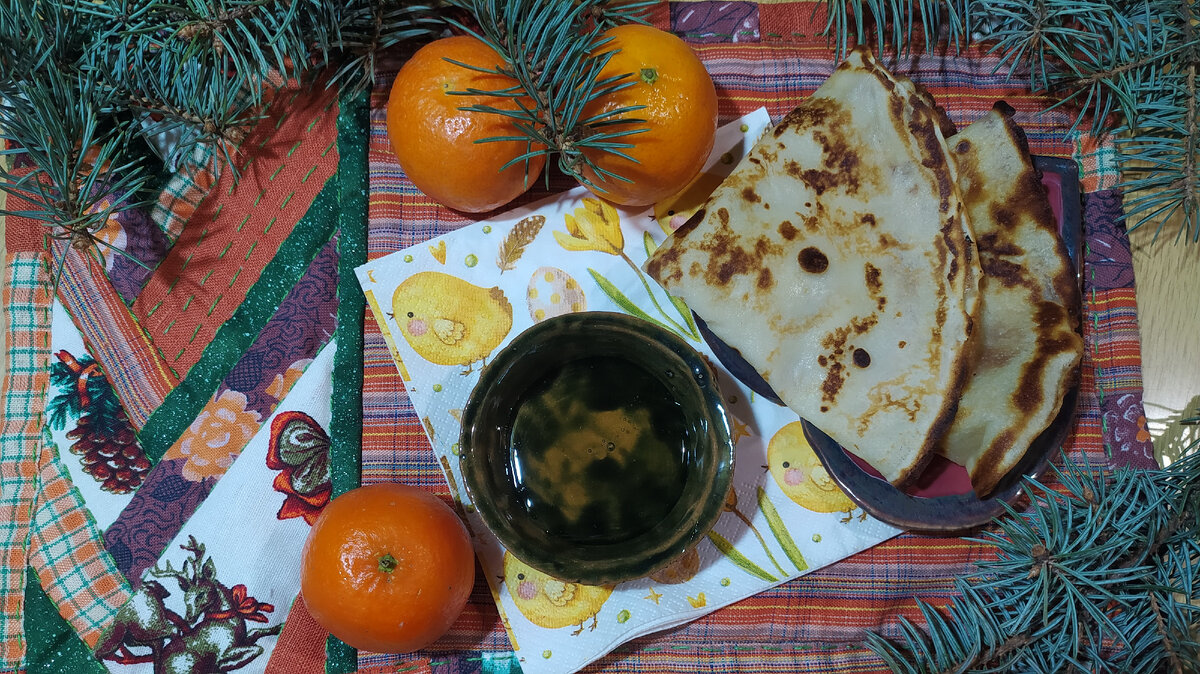 Жизнь зла! От бессонницы помогает только вкусный перекус при свете звëзд. Как с этим бороться, кто подскажет? Пока плыву по течению. Вчера вот тоже сдалась после полуночи. Смотрела на огоньки окраины сквозь еловые ветки и решила: "А не заглянуть ли в холодильник, вдруг там что-то сонное укрывается?" Кстати, о красивой лоскутной салфетке на первом фото, ланчмате, рассказала здесь: Продолжаю изыскания в ответ на запросы внезапного ночного аппетита: В холодильнике нашлось совсем немножко молока и яйца. Мог бы стать омлет. Но нет. Хвойный аромат каким-то невероятным финтом пробудил воспоминание о мëде, лучшей сласти в мире! Ну, и Млечный Путь над Волгой указал решение. Пусть будут блинчики под ëлочкой, раз уж всë равно не спится. Пара яиц, чуточку молока, щепотка соли, немного сахара, муки на глаз, а точнее, на тактильное чувство при замесе. Сковорода греется, мой животик радуется. Пока выпекались 4 блинчика, положила в плошечку немного мëда. Чудесные керамические посудки я перио