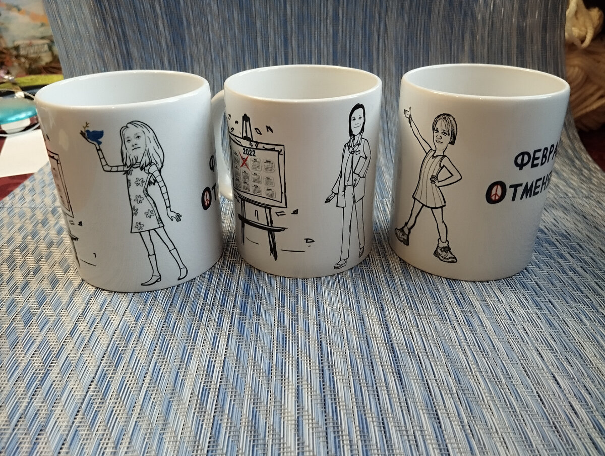 Так что везу в подарок кружки )) Рисунки рисовала предыдущие рабочие дни - с трассировкой лиц по фото пришлось помучиться. Пригодных нормальных нейросетей я не нашла.