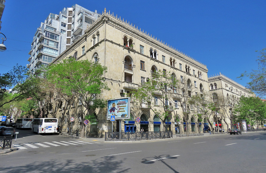 Напротив, в те же 1910-12 годы тот же архитектор Гавриил Тер-Микелян построил особняк нефтяников Садыховых. Над ним нависает огромное здание Президентского дворца (1977-79), бывший ЦК КПСС АзССР.