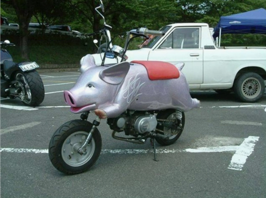 1. Кто из животных в зоопарке самый быстрый? Конечно, мотосвинка на двух колёсах. Она может и круг первой проехать, и на вили выйти, и стопи сделать. Всё ей под силу, особенно, если под управлением умелого райдера! 2. Почему запрещены самодельные мотоциклы? Не только потому что большие дяди хотят много зарабатывать. Но ещё и из-за того, что ездить на изобретениях кулибиных действительно часто просто опасно! Вон у этих байкеров отвалилась люлька прямо на ходу: и хорошо, что никто не пострадал! 3. Сколько улыбающихся физиономий на этом изображении? Всего три вместе с собакой. А вот мотоциклетная коляска явно настроена не столь добродушно, вот она и оскалилась в носовом рисунке. Что же можно требовать от военного транспорта?! 4. Тот самый нелепый вид, когда долго строил мотоцикл мечты, но в итоге так увлёкся, что не смог верно рассчитать высоту руля, из-за чего весь байк смотрится комично. А ведь всего-то надо было делать перерывы и давать мозгам отдых! 5. Если хочется владеть мотобай