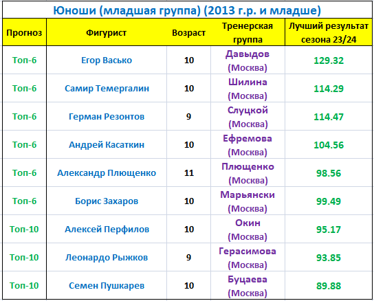 В старшей группе 17 заявленных участников. Из заметных по прошлым сезонам юношей не выступят все еще восстанавливающиеся после травм Ярослав Хрулев и Кирилл Жураховский. По возрасту мы можем судить кто будет второй год принимать участие в старшей группе (12-летние), а кто перешел из младшей и в старшей группе его ожидает дебют (11-летние). Собственно такую ротацию мы наблюдаем каждый год, а те кому сейчас 12 лет в следующем сезоне уже пойдут на повышение в юниоры.