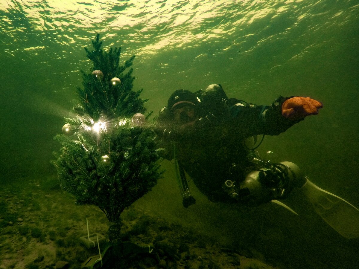 Но без елки нельзя было обойтись. Новая «лесная» пластиковая красавица прежде чем погрузиться на дно была оснащена грузами, в целях безопасности обитателей озера было решено отказаться от мишуры, а елочные игрушки надежно закрепили стяжками. Хоровод под водой вокруг елки - это не просто дань традиции, а еще и хороший повод отработать свои навыки и сделать несколько необычных фото.