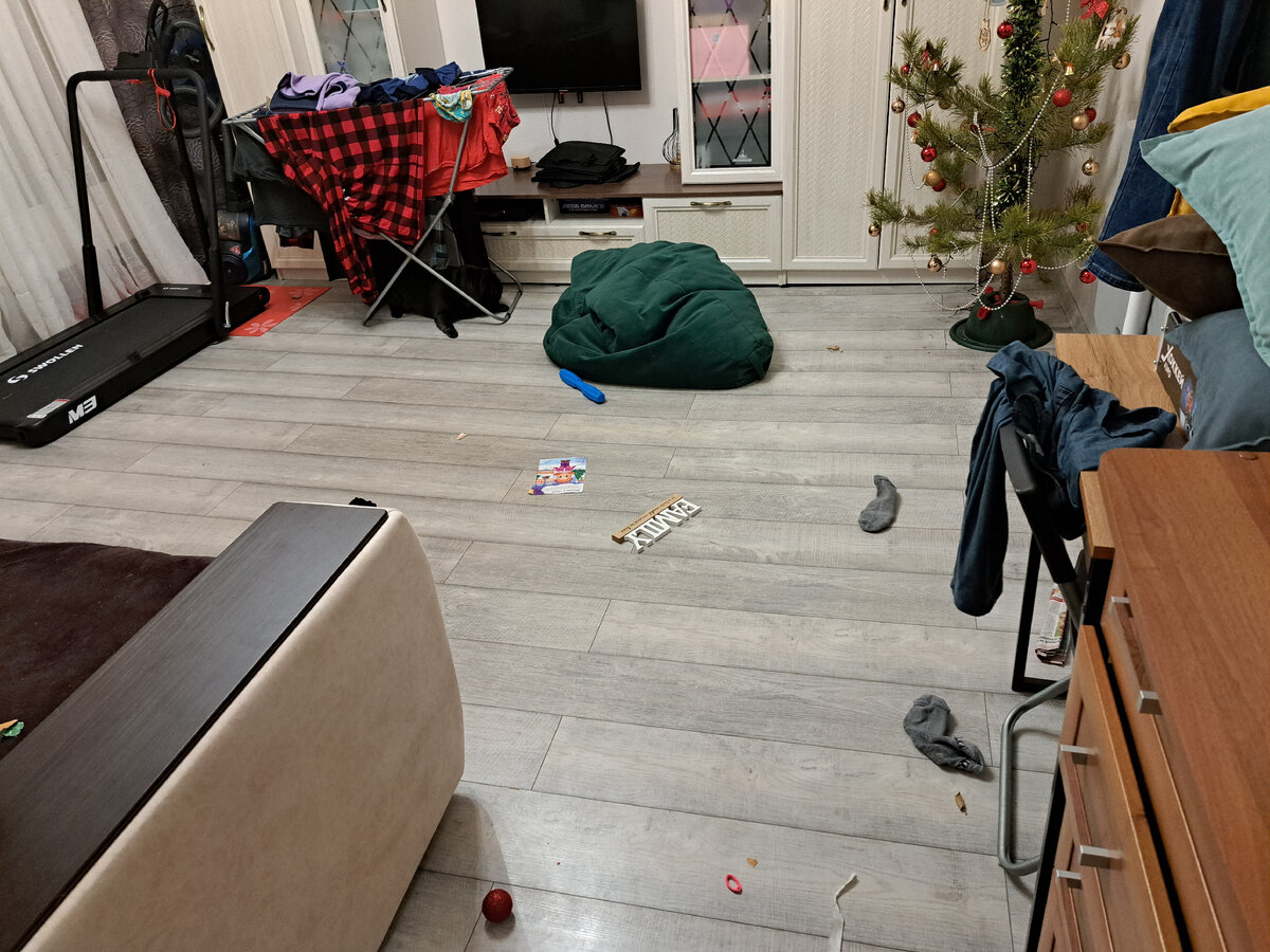 Всем Привет! Вчера придя домой обстановка была не лучше. Снова все валялось. А главное музыка опять играла, он снова включил колонку. А когда мы ночью вернулись из гостей на полу лежала ёлка, он запутался в гирлянде 🫣 Сегодня муж утром увёз его на охоту. Пусть всю дурь выбегает.