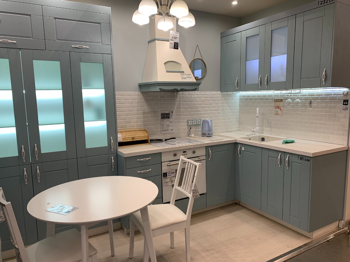 Всем огромный привет! Много раз вы просили сделать свежий обзор кухонь в Леруа Мерлен. Сегодня я посетила этот магазин с целью сделать для вас обзор кухонь в этом магазине. Покажу какие кухни сейчас есть в продаже. Начну с самой большой кухни. Она называется Томари. Кухня угловая. Материал МДФ. Размер данного комплекта мебели 320*160 см. Стоимость гарнитура без учета столешницы, мойки, смесителя, стеновой панели 120 383 рубля.