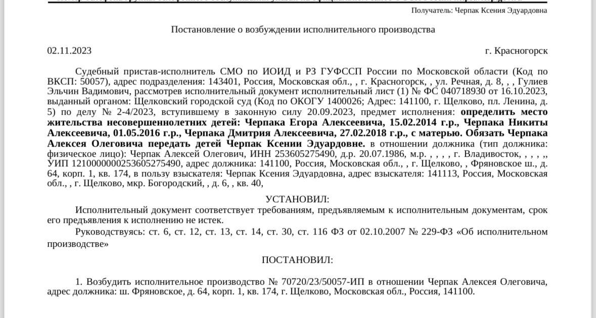 Как мы уже знаем, место жительства трех детей определено с мамой. А, соответственно, алименты на деток с папы взысканы с момента обращения в суд.⠀Я об этом писала здесь Кому лень искать прикрепляю: Как только постановление суда вступило в силу, Щелковские приставы насчитали Алексею Черпаку долг по алиментам в 1,7 млн. рублей. Насчитали, кстати, маловато – допустили кое-какие ошибки, но надеюсь их вскоре исправят.⠀