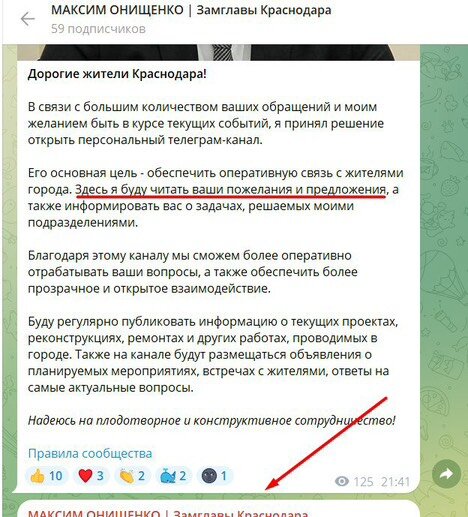 Вице-мэр Краснодара Максим Онищенко к 13 января предложил жителям города в своем тг-канале оставлять пожелания и предложения по работе администрации под постами, у которых отключена возможность оставлять комментарии. Максим Онищенко 12 января создал свой персональный телеграм-канал, чтобы поддерживать оперативную связь с жителями города. «Здесь я буду читать ваши пожелания и предложения, а также информировать вас о задачах, решаемых моими подразделениями. Благодаря этому каналу мы сможем более оперативно отрабатывать ваши вопросы, а также обеспечить более прозрачное и открытое взаимодействие», - написал вице-мэр. Скриншот с тг-канала Максима Онищенко Однако заместитель главы Краснодара закрыл комментарии, где жители могли бы сообщить о проблеме, поделиться предложениями. Первым на это обратил внимание автор тг-канала «Сарказм Помидоррова». «Но не здесь», - кратко написал активист-юморист. К слову, публикация Андрея Помидоррова уже собрала более 43 «смеющихся смайликов». Некоторые комме