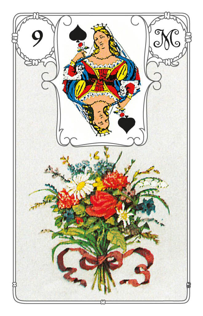 Девятая карта. имеет название "Букет". На ней изображен букет цветов и пиковая Дама как на карте из игральной колоды. Символизирует - подарок. Является знаком подарка, возрождения и чистых намерений. Красоту и гармония. В Традиционном значении карта является хорошей. Символизирует ровное течение дел с сочетанием успеха, хорошего самочувствия. Искренную и чистую любовь. В раскладах на Взаимоотношения карта означает, что на человека или пару людей на которых делают расклад будет ждать приятный сюрприз в отношениях. В раскладах на Деловые отношения и/или Работу карта означает, что в этих делах у человека на которого делают расклад ждёт спонсорство, увеличение доходов и будут ожидать благоприятные обстоятельства. В раскладах на вопросы по Здоровью карта отвечает, что у человека на которого делают расклад на данный момент хорошее самочувствие, если человек сейчас болен то в скором времени пойдёт на поправку. Источники: 1. Большая книга карточных игр, пасьянсов, гаданий, фокусов. Карты Тар