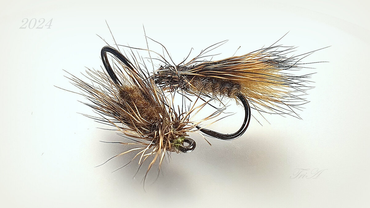 Пожалуй самая востребованная мушка по многим видам рыб. Крючок Hanak H130BL #10 Нить UNI-Thread 6/0 Закрепляем перо СДС, желательно с длинной остью и редкими бородками. С помощью перодержателя скручиваем перо и формируем тело мушки. На 2/3 длины цевья. Подстригаем торчащие бородки. Закрепляем подкрылок из меха лапки зайца. Добавляем крыло из меха лося (оленя). Закрепляем пенку, а лучше бородки пера фазана или т.п. Грудку формируем даббингом. Хакл делаем из меха косули в дабпетле. Разведя бородки меха по сторонам закрепляем пенку. Формируем головку и покрываем лаком. Причёсываем ножки и закрепляем лаком. Мушка готова. У сухих мушек важно, на мой взгляд, её положение на воде и наличие плавучих мало намокаемых материалов.