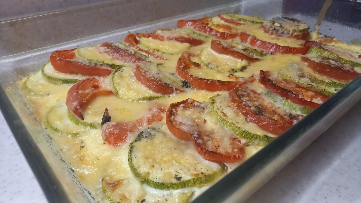 ОВОЩНАЯ ЗАПЕКАНКА в СМЕТАННОМ СОУСЕ Неожиданно захотелось приготовить что то овощное и вкусное) Я не буду писать пропорции, т.к они зависят от вашей формы. у меня 25 на 35 см. -Помидор (покупаю исключительно розовые, они хотя бы пахнут помидорами) -Перец красный -Кабачок 2 яйца, сметана 15% жирности, сыр, базилик, соль, перец черный. Посыпаю солью, перец, базилик. Смешиваю в блендере сметану и 2 яйца, заливаю соусом овощи, в духовку на 30минут 180 градусом. Посыпаю сыром и еще минут на 5.