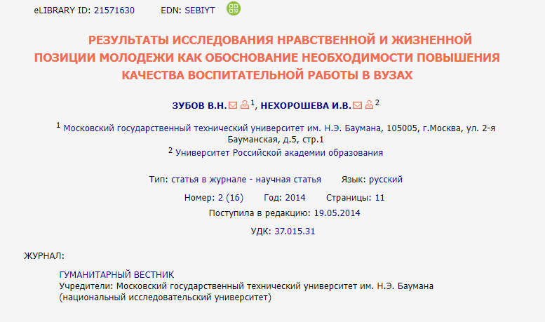 Зубов В.Н., Нехорошева И.В. Результаты исследования нравственной и жизненной позиции молодежи как обоснование необходимости повышения качества воспитательной работы в вузах // Гуманитарный вестник. 2014. № 2 (16). С. 11. EDN: SEBIYT
