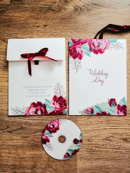 Большие конверты с напечатанными фотографиями и диском при съемке от 8 часов, маленькие конверты с диском - от 2 часов свадебной съемки