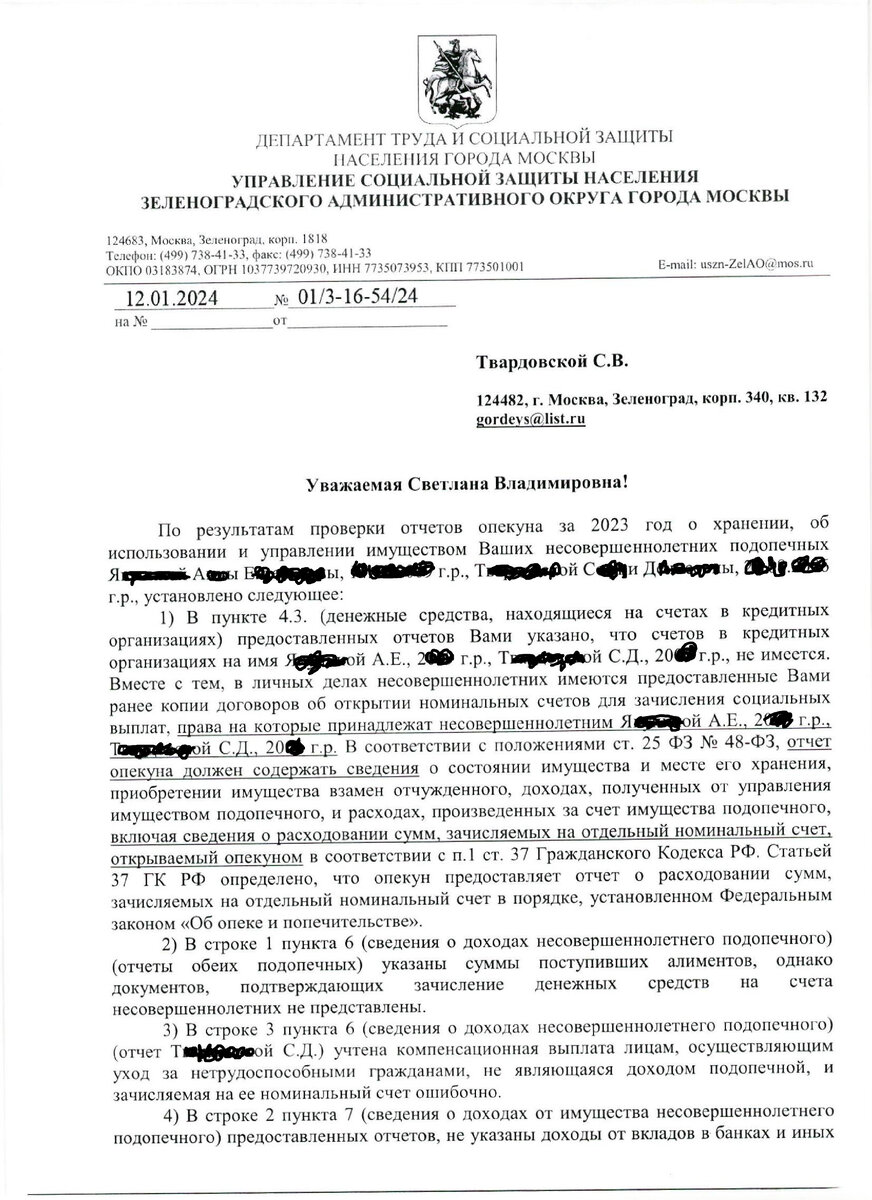 на mos.ru, подобные тем, что выдвинуты сейчас, до этого письма я упрямо сопротивлялась их видению отчета и из акта в акт мне годами писали, что я безответственный опекун и отчёты за прошлые годы не утверждены. Прошу также указать Управлению социальной защиты населения Зеленоградского Административного округа города Москвы на противозаконность выдвинутых мне и выдвигаемых другим опекунам подобных требований