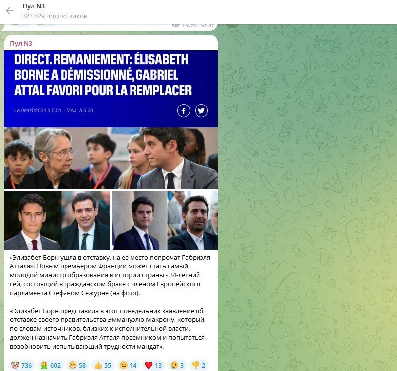 Я коротенечко. Так, чисто на поржать. Помните, какой у Фанции символ? Правильно, петух. Что в свете нынешней повестки - крайне символично. Итак, как вы все наверняка знаете, вечером 8 января премьер-министр Франции Элизабет Борн приехала в Елисейский дворец, где ее ждал президент Эмманюэль Макрон. А покинула дворец она уже в роли экс-главы правительства. Отставка называется. Новым и самым молодым премьер-министром Франции стал извращенец Габриэль Атталь. Ему 34 года, и он открыто признаётся, что состоит в "гражданском браке" с членом Европейского парламента Стефаном Сежурне. Что касается Стефана, то это - 38-летний лидер партии «Возрождение» и теперь, с подачи совего любовника, он становится главой МИД Франции. Вот такой вот поворот и гейская коррупция. Таким образом, Франция - всё…. Мы думали, её арабы и африканцы потопчут, но нет, французы справились сами! Петух, как символ свободной Франции - как никогда кстати!!