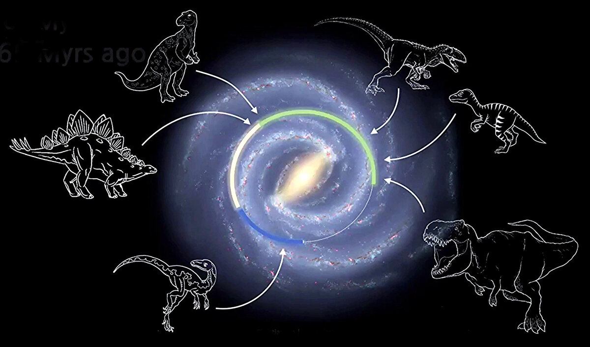 Вот и закончился 18-й галактический год, начинается новый. Земля вместе с Солнечной системой снова оказалась в той же точке, в которой находилась в начале прошлого «года» – 250 миллионов лет назад. Наша Солнечная система совершила один полный оборот вокруг центра Галактики. Точную дату этого события, конечно, никто назвать не может. Но известно, что это вот-вот произойдет – возможно, как раз на старый Новый год. Поэтому всех Землян можно поздравить с наступлением Нового галактического года. На иллюстрации, составленной в честь этого знаменательного события, показан наш путь в галактике с обозначенными «историческими вехами». Ими стали динозавры, разные виды которых жили на Земле в различные эпохи. Появились ящеры в начале прошлого галактического года. Их расцвет пришелся на «май-июнь-июль», время, когда Солнечная система находилась на другой стороне Млечного Пути. До «октября» динозавры жили припеваючи, пока не прилетел огромный астероид, который врезался в Землю 66 миллионов лет назад