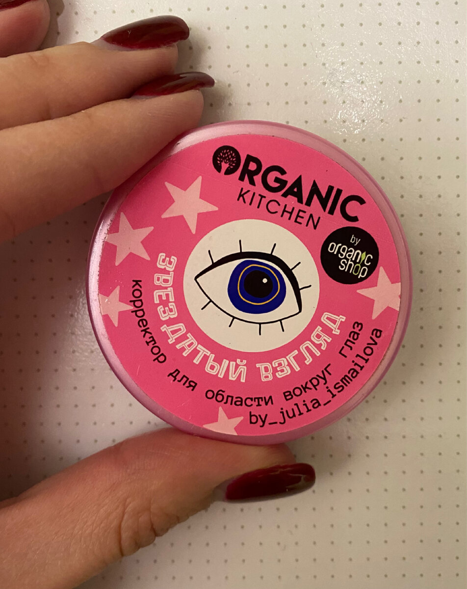 Доброго времени суток, дорогие читатели! Сегодня хочу поговорить и поделиться своим отзывом на корректор для глаз “Звездатый взгляд” от Organic Kitchen. Начну свой отзыв с привлекательного названия продукта «Звездатый взгляд», которое звучит очень громко и интригующе, не правда ли? Так как у меня ярко выраженные темные круги под глазами, я всегда пользовалась различными корректорами, но в течение всего дня они скатывались, впитывались и оказывались совершенно не стойкими. Я по рекомендации мамы решила попробовать этот чудо-корректор, так как мне всегда хотелось иметь тот самый “звездатый взгляд“. Я заказала этот корректор на Wildberries за 360 рублей (артикул: 38638654), на момент публикации в Золотом Яблоке на него скидка и стоит он всего лишь 255 рублей (хороший шанс успеть приобрести!) Корректор, объемом 10 мл, продается в небольшой баночке, которая легко поместиться в сумочку или косметичку. Расход у этого средства очень экономичный, я покупала корректор год назад и у меня осталос