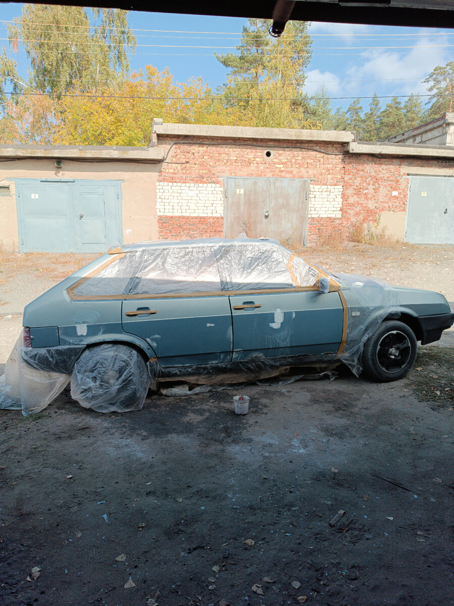 Приветствую, думаю вы поняли по заголовку о чëм пойдëт речь, поэтому не будем говорить просто так и начнëм. Для начала я оценил план работы и примерно посчитал сколько мне потребуется краски,гранту, лака. Решил сделать всë по красоте, собрался и поехал в подбор цвета, в итоге мне насчитали 5000 за литр краски, всë зависит от цвета, а цвет у моей ласточки сложный, это не ниагара, как оказалось,у меня ушло 2,5 литра. Я конечно же не стал брать подобранную краску, а поехал в соседний магазин и купил похожую краску, вот теперь ниагара, за 1300 за литр, там же взял банку лака, грунта и шпакли баночку. Извиняюсь, что не фоткал названия материалов. Я не заморачивался и красил на улице около гараже, думал что будет много пыли,на самом деле оказалось меньше,обклеиваем стëкла, бампер,колëса, всë что не хотим покрасить. Самое главное подготовить авто перед покраской,зачищаем всë мелкой шкуркой, чисто заматовать, далее шпаклюем неровности и обезжириваем.На ржавые места, предворительно зачистив,