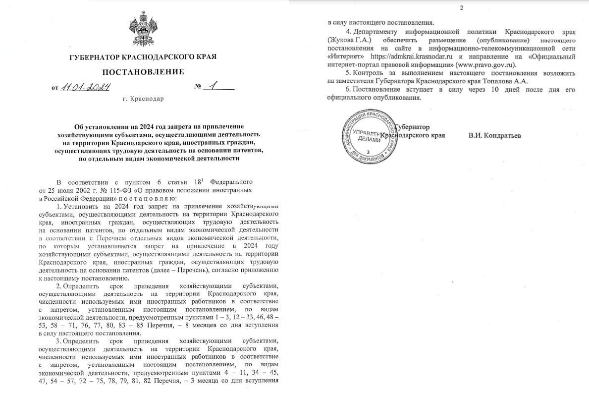 В Краснодарском крае продлили на 2024 год запрет на трудоустройство мигрантов по патентам — в регионе под запретом 85 сфер деятельности для иностранцев