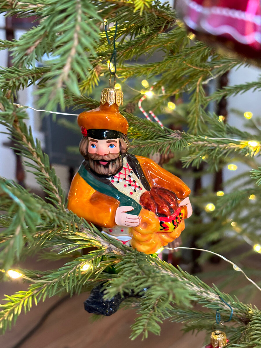 Решила немного рассказать про свои елочные игрушки, просто потому что сама их очень люблю. Первая в моей коллекции появилась в 19 году. Это купец с баранками от фабрики Ариэль. Он уже успел пережить мою не самую аккуратную реставрацию после падения и теперь у него один сапог неровный и больше другого. Позже у него появилась подруга — купчиха от той же фабрики. Во время визита в Москву в декабре 2021 увидела сюжет по утренней программе о московских ярмарках. В нем промелькнул Гагарин из ваты, которой в итоге был куплен как сувенир из поездки. Сделан вручную в деревне Кузьмино — не знаю, это маркетинговая история для москвичей или действительно так — но он прекрасен и весит как пушинка. Еще года три назад я порой покупала стеклянные игрушки в Фикс Прайсе, но теперь собираю только игрушки, сделанные в России или что-то сувенирное из других стран. Правда в этом году из иностранного только белорусская соломенная кукла :) Но и бездушное что-то осталось, например, эти игрушки с досанкцион