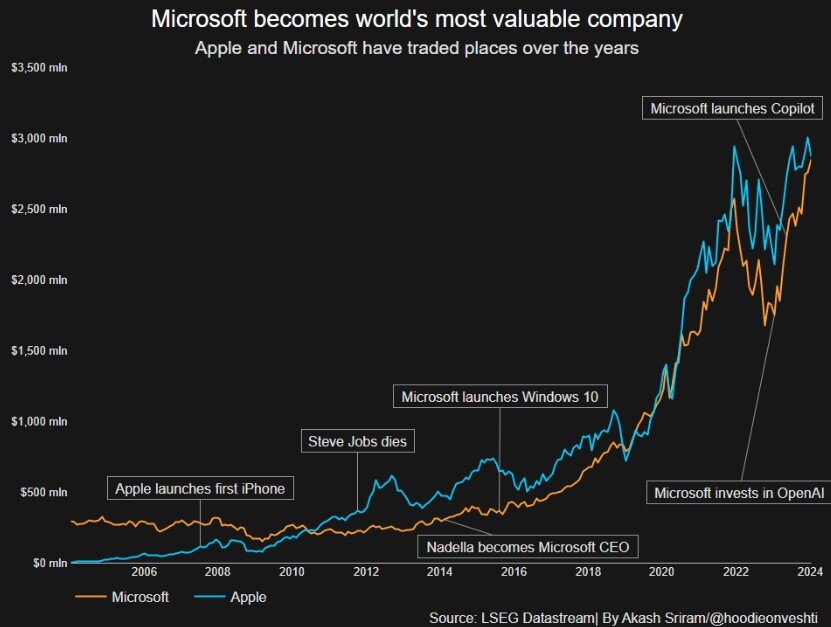В течение длительного времени Apple занимала первое место в мировом рейтинге публичных компаний. Однако вчера ситуация изменилась — ее "перегнал" не менее известный американский конкурент, хотя и с небольшим отрывом. Компании Microsoft удалось обойти Apple, их акции вчера ненадолго выросли на 2%, увеличив рыночную стоимость компании до $2,903 триллиона. В то же время акции Apple упали на 0,3%, что привело к снижению ее капитализации до $2,886 триллиона. Этот успех Microsoft объясняется развитием направления генеративного искусственного интеллекта: компания инвестирует значительные суммы в OpenAI и их продукт ChatGPT. Кроме того, появление искусственного интеллекта в программном обеспечении Microsoft положительно сказалось на восстановлении бизнеса в области облачных вычислений. В то время как Apple продолжает бороться с снижением спроса, включая спрос на iPhone. Особенно резкое снижение популярности "яблочных" смартфонов наблюдается на китайском рынке, где также уверенно наращивае