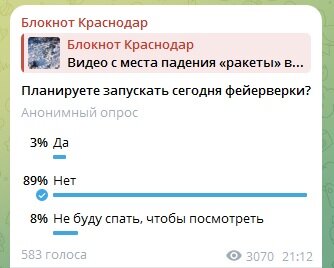 Одни жители города наблюдали за фейерверками в небе и праздновали Старый Новый год, другие уже спали. Кто-то проснулся от шума. Накануне праздника «Блокнот Краснодар» опросил горожан, планируют ли они запускать фейерверки в ночь на 14 января. В голосовании поучаствовали более 580 человек. Всего три процента из них или 19 человек сказали, что собираются устроить фейерверк. 89 процентов или 521 человек