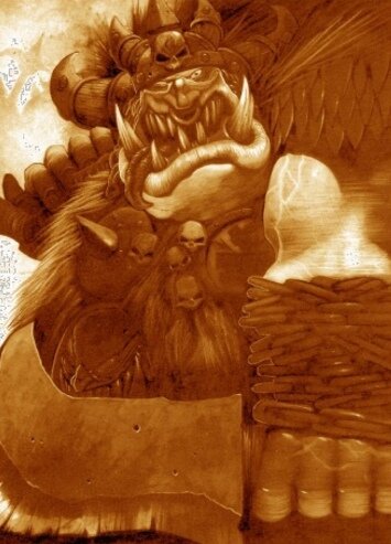- Нууу... - проворчал юноша, — Мне не очень-то нравятся головы орков... но я съел его глазные яблоки, смотри!- С этими словами юный огр глупо ухмыльнулся и поднял ужасные останки орка. Даже сейчас на отрубленной голове орка можно было распознать выражение гнева зеленокожего, что навечно застыл на его лице, после того как Голгфаг сразил его.