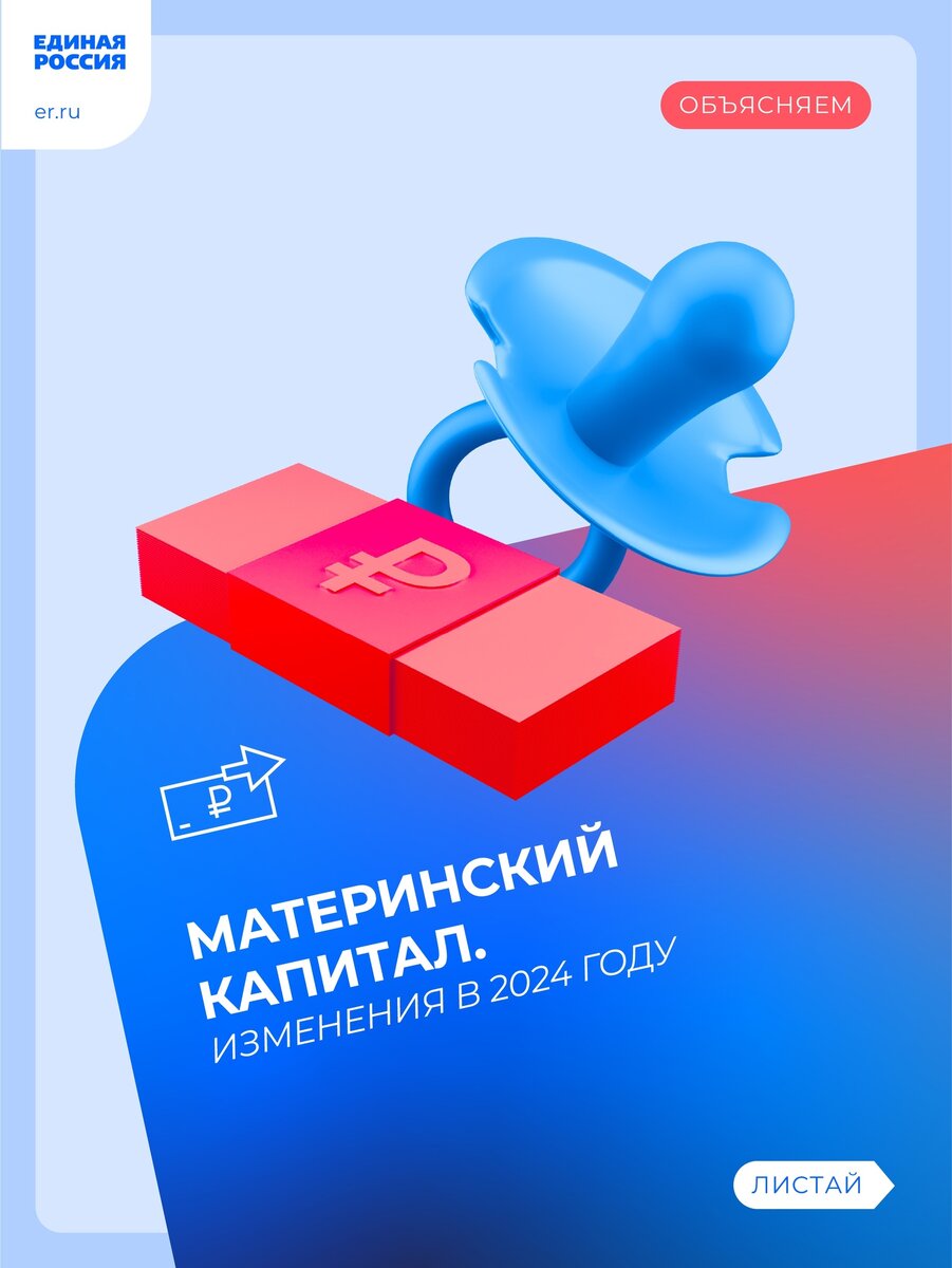 Что меняется в правилах получения маткапитала в 2024 году? Сумма вырастет, а ещё вступают в силу новые требования к тем, кто может его получить. Подробности — в карточках от Единой России. #ЕдинаяРоссия #ЕРДНР #полезно