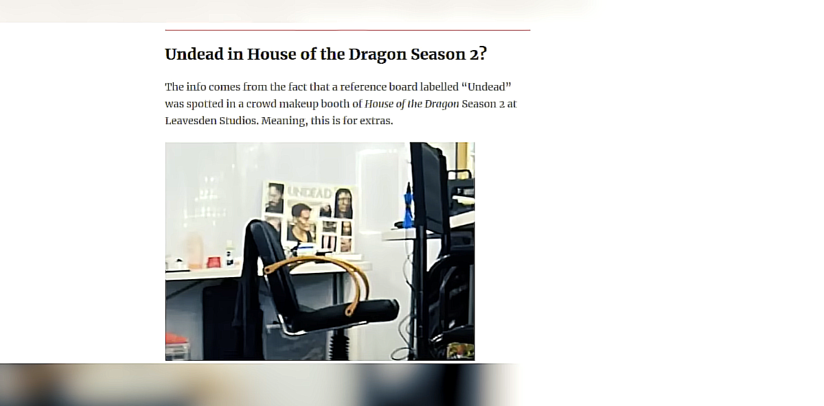 Речь идет с гримёрной для массовки, там была обнаружена референс доска с заголовком Undead (Нежить) по которой, судя по всему, гримируют второстепенных актёров. На фотографии видно, что доска включает в себя изображения, позволяющие представить, как могли бы выглядеть воины из армии мёртвых, изображений сразу несколько. Они разные их можно использовать, как основу для создания большого количества образов.