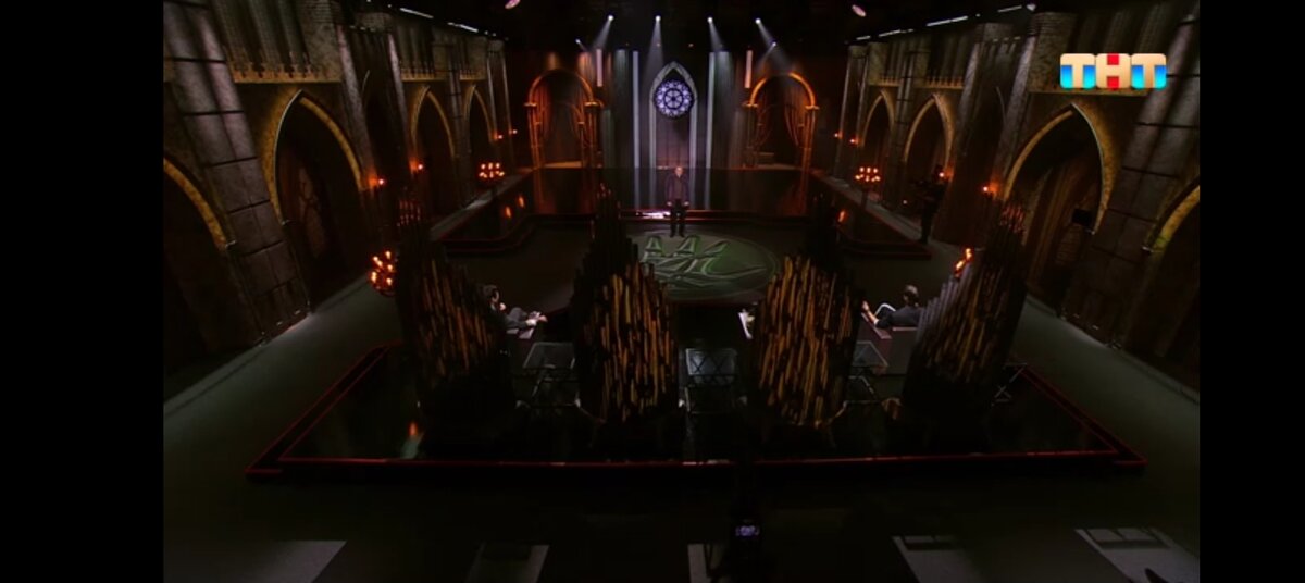 Студия просто вау! Оформлена в темно-коричневом цвете. Горящие свечи в канделябрах настраивают на мистический лад. А высоченные декорации, стоящие за спинами кресел создают впечатление, что каждый член жюри сидит на настоящем троне.