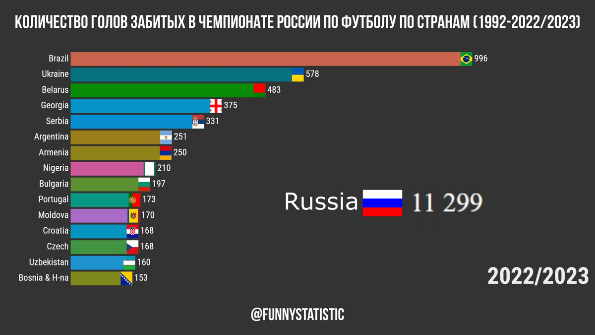 Разумеется никто даже близко не подобрался по количеству голов к российским футболистам (11299). Бразильцы с большим отрывом самые результативные легионеры в нашем чемпионате. В Топ-15 зарубежных стран по количеству голов в ЧР сразу 6 стран из числа бывших советских республик: Хотя бы один гол в Чемпионате России по футболу начиная с сезона 1992 по 2022/2023 забили представители 91 страны. Само собой автоголы не учитывались