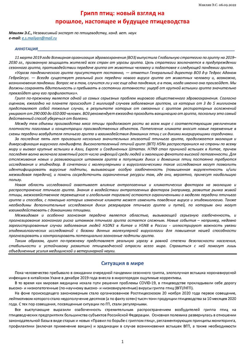 Грипп птиц: новый взгляд на прошлое, настоящее и будущее птицеводства, 2022 (полная версия)