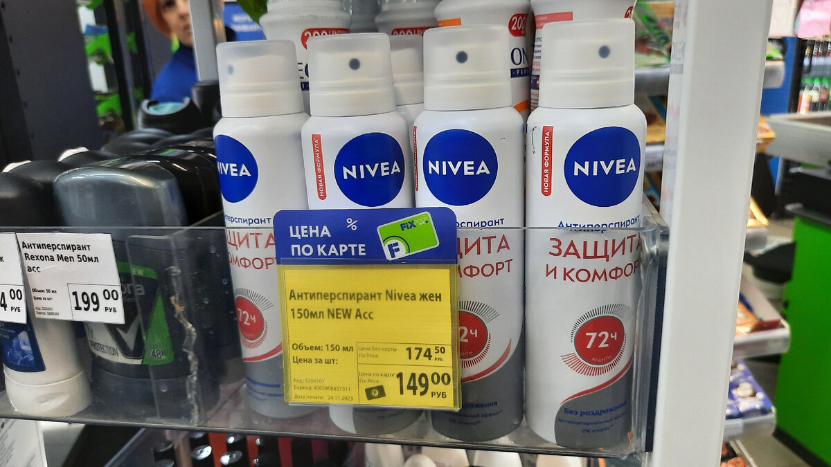 На стойке возле кассы Женский антиперспирант, Nivea, подарит Вам надёжную защиту от запаха и комфорт. Без этилового спирта. Перед использованием ознакомьтесь с инструкцией по применению и мерами предосторожности на упаковке. Объём: 150 мл.Цена по карте 149 руб.
