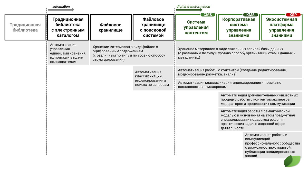 - Экосистемная платформа управления знаниями – реализуется в платформенной логике и обладает существенно расширенным функционалом в части семантических классификаторов и обработки семантических связей, анализа метаданных и формирования метаклассификаторов, интеграции со сторонними информационными ресурсами, формирования и развития сообщества экспертов и модераторов. Ключевой особенностью является способность интегрироваться с другими платформами и системами управления знаниями, как на уровне данных и алгоритмов, так и на уровне семантических моделей.
