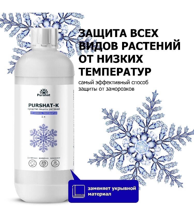 Криопртектор Пуршат-К представляет собой концентрат для приготовления раствора. 10-ти литров будет достаточно, чтобы обработать примерно 300 «квадратов» зелени. В составе средства – силикаты, карбонат кальция, калия и магния, глицерин, соли кремниевых кислот, аминокислоты.