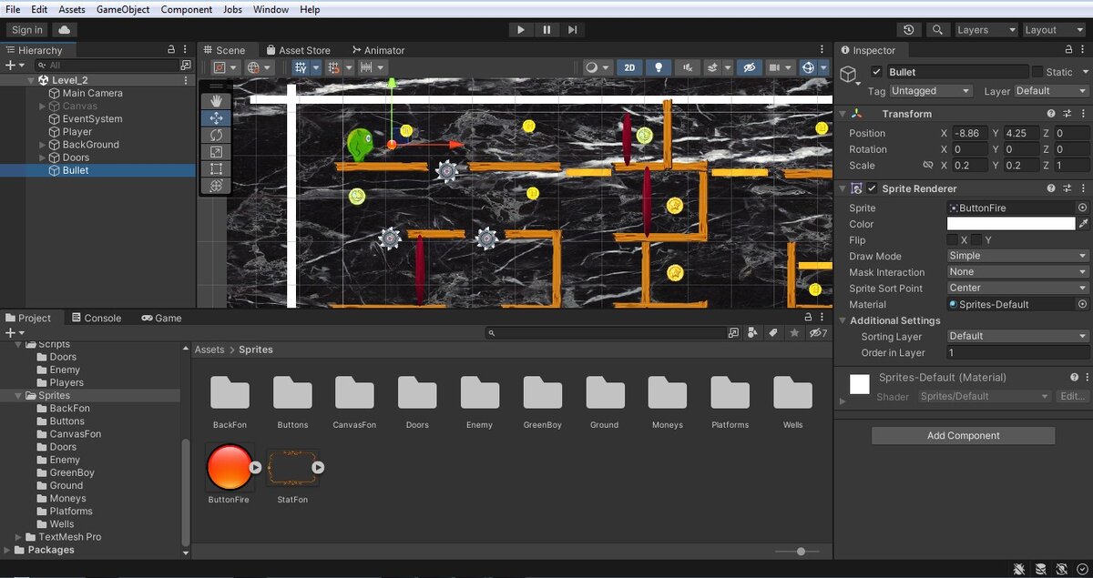 Затем тащим спрайт на сцену, даем имя Bullet, ровняем габариты, поставив снаряд рядом с игроком, так сказать для наглядности
