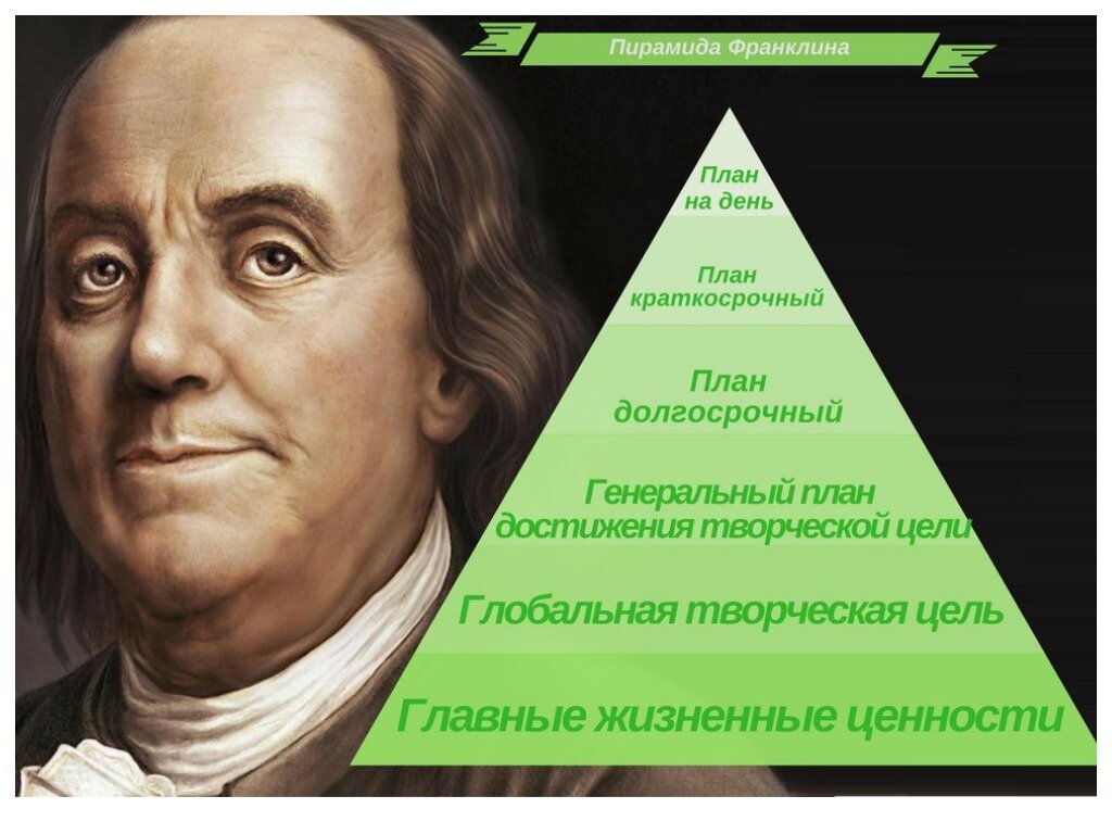 О Бенжамине Франклине нужно писать отдельную статью, так как этот удивительный человек оставил след практически в любой области, с которой он работал. Он был необычайно работоспособным и умел правильно распоряжаться своим временем. Умел сосредотачиваться на главных вещах. И никто, до сих пор, не может разгадать секрет его успешности. Как мог, мальчик из бедной семьи, столького достичь. Единственно, что стало известно, что для планирования он использовал особую систему, где указывал ценности, краткосрочные и долгосрочные цели. Эта система в настоящий момент называется пирамидой Франклина или пирамидой продуктивности. Где большая цель разбивается на ступени, позволяющие представить реальность достижения цели и добиться задуманного.