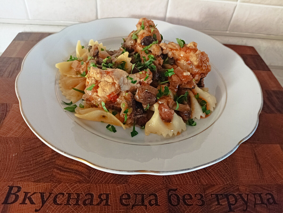 Готовлю под крышкой до готовности курицы на слабом огне минут 30-40 (время зависит от величины кусочков курицы). За 5 минут до готовности добавляю измельчённые каперсы (или мелко нарезанные корнишоны), чеснок и лавровый лист.