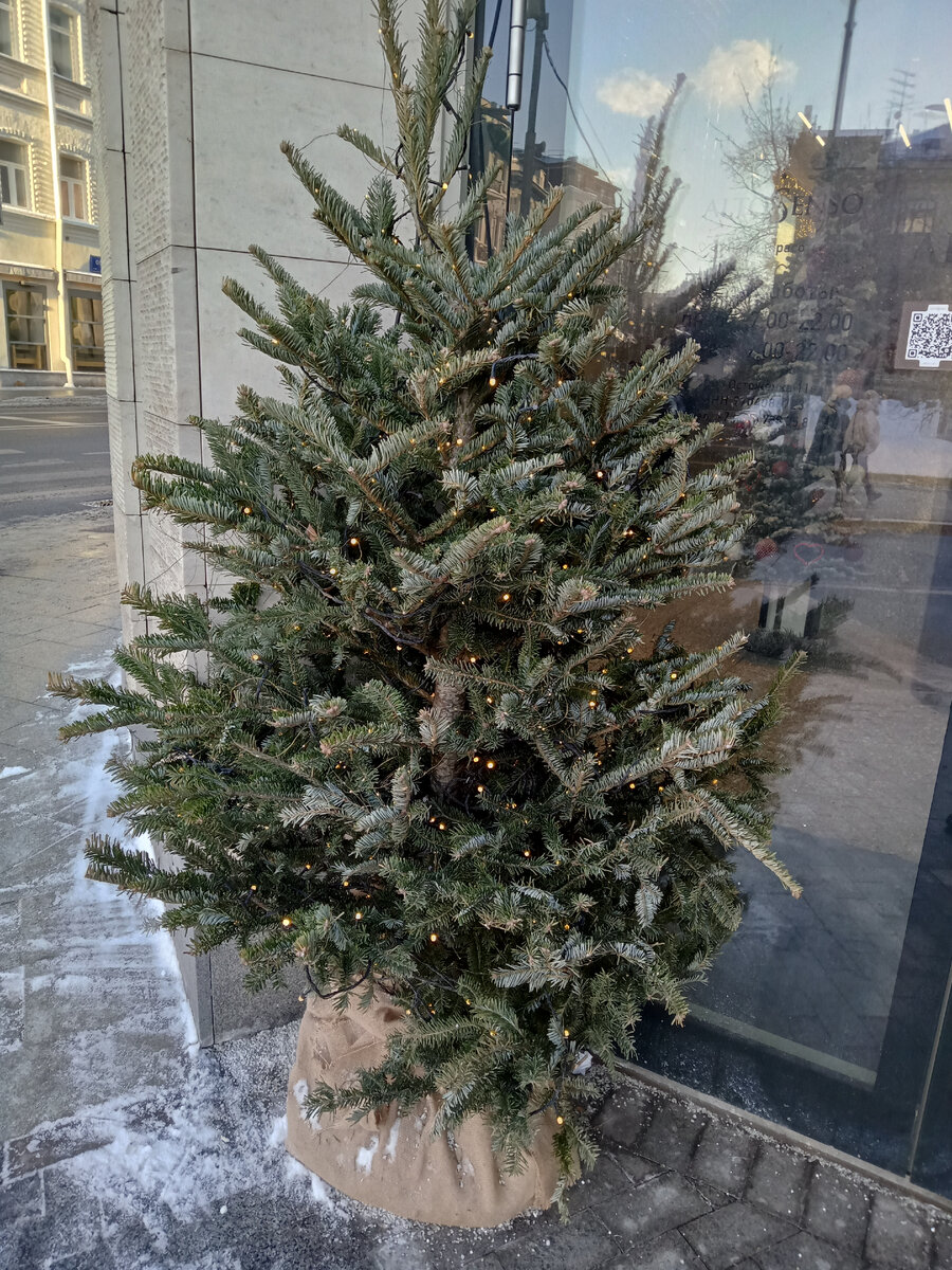 Заканчиваются новогодние праздники, но никуда не уходит новогоднее настроение!) Уж до начала февраля точно оно никуда не уйдёт!) А помогает в этом вездесущая новогодняя атрибутика и символика!) Гирлянды, новогодние шары, инсталляции...все это можно увидеть на улицах больших и малых городов не до февраля, а даже до нача марта, то есть до самой весны!) О Пихте Фразера я уже писал https://dzen.ru/a/Y7HqH4OKTEwFYHcD и https://dzen.ru/a/ZWpFzBANNnYtoWhW. До недавнего времени я думал, что Пихту Фразера в нашей стране покупают исключительно для того. чтобы использовать дома в качестве новогоднего дерева. Ну, или, чтобы высадить её у себя на дачном участке. Но, гуляя в центре Москвы, в районе улицы Остоженки и Зачатьевских переулков, у входа в салон красоты увидел Пихту Фразера в качестве украшения экстерьера. Могу, конечно, ошибаться, но, по-моему, это она и есть!) Не зря я ее уже несколько лет покупаю домой в качестве новогоднего дерева!) Рядом есть украшение из хвойных веток разнообразных