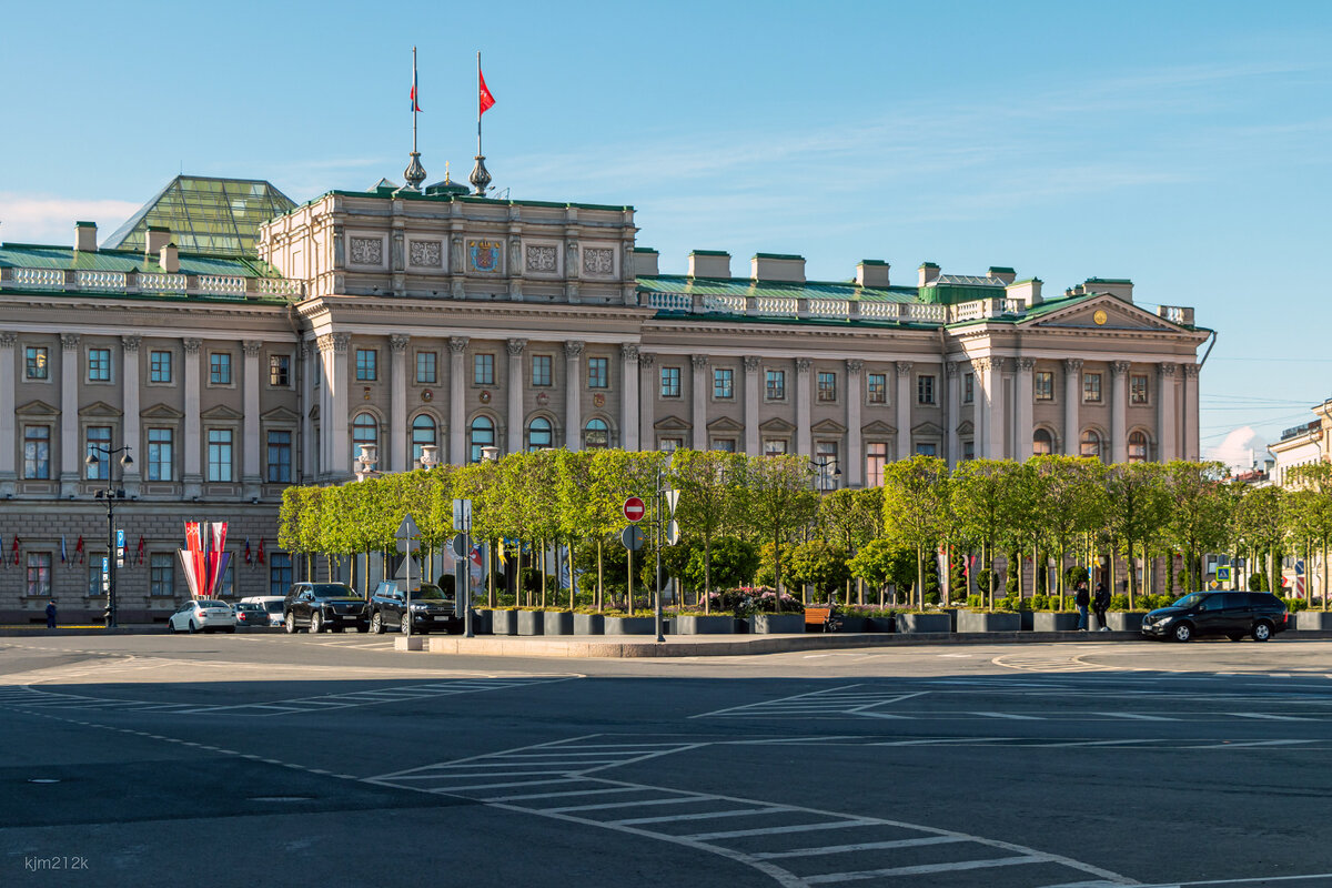 Мариинский дворец и неочевидный для взгляда с уровня земли Синий мост через Мойку, настолько широкий, что является частью Исаакиевской площади. Вдоль здания Министерства имуществ тоже поставили вазоны с цветами, как на Большой Морской. Ярко-желтые клумбы перед Мариинским дворцом Вид на сад от парадного входа Мариинского дворца. Под стоянку для машин чиновников оставили небольшой участок. Сад состоит из шести различных боскетов. Вот это, например - шахматный сад. Вазоны образуют шахматную доску, а стриженные под пешки туи - фигуры на ней. Другой участок, с туями-штопорами Кадки с растениями перемежаются скамейками, полу