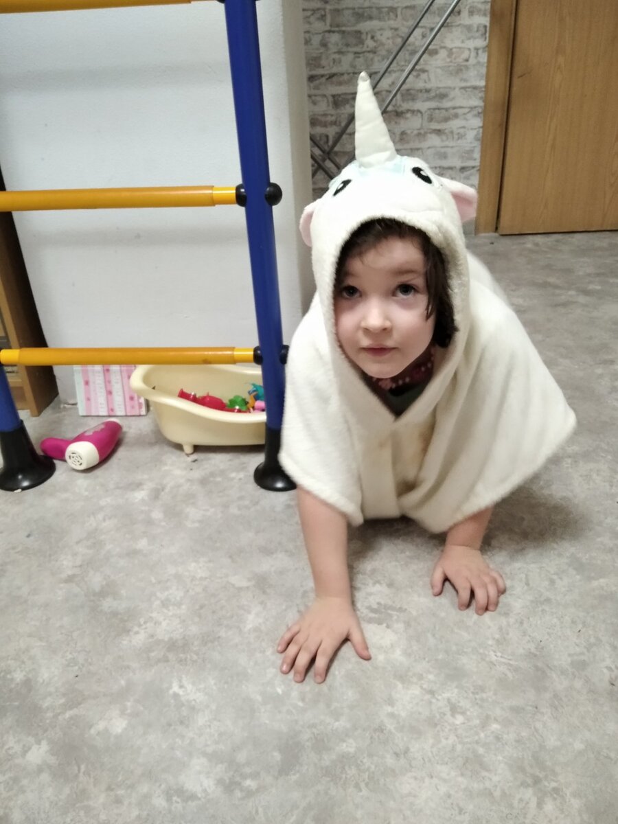 С этими словами так же загадочно скрылась. За Катей перед нами предстала на четвереньках в полотенце с капюшоном единорожка. Она стащила зубами со стула зайца и промяукала, что хочет спать. Залезла ко мне на коленки и заснула на них вместе с ушастым. В это время