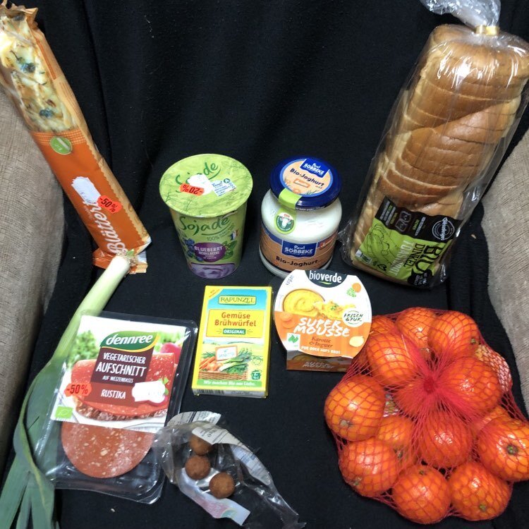 На этой неделе в среду опоздала на бесплатку, но привезли много и кое-что выбрала для нас с Даней. Сладкие йогурты в стекле и пластике по 500 гр. для Дани, Тесто - ещё ничего не делала, что делать с ним даже не знаю, может, подскажите. Хлеб - вкусный. Лук-порей - люблю во всё бросать. Веганская колбаса - гадость, для Дани. Она это каким-то образом умудряется есть. Бульонные кубики - гадость. Морковный супер мусс - гадость, для Дани. Мандаринки - вкусные, сладкие, для меня, Даня их не очень уважает. Три конфетки с марципаном - для Дани. В четверг слегла с ангиной, не пошла в кухню за продуктами. В пятницу, всё ещё больная, заглянула в кухню - продуктов было много, но решила, что готовит не в состоянии и взяла только бутылку овсяного молока. Странным образом, в Берлине понравилось веганское молоко, особенно овсяное, дома в продаже такое не видела. Продукты тоже покупаем, но лень стало покупки выкладывать… всё равно беру, практически, одно и тоже.