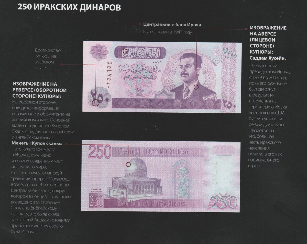 ИРАКСКИЙ ДИНАР СТАЛ НАЦИОНАЛЬНОЙ ВАЛЮТОЙ ИРАКА В 1932 ГОДУ, КОГДА СТРАНА ПОЛУЧИЛА НЕЗАВИСИМОСТЬ ОТ СОЕДИНЕННОГО КОРОЛЕВСТВА. ДО ЭТОГО В ДЕНЕЖНОМ ОБРАЩЕНИИ ЗДЕСЬ НАХОДИЛАСЬ РУПИЯ ПЕРСИДСКОГО ЗАЛИВА. ДИНАР НЕСКОЛЬКО РАЗ ПЕРЕВЫПУСКАЛИ, ПОСЛЕДНИЙ - В 2010 ГОДУ. Когда в 1932 году динар стал национальной валютой Ирака, 1 динар (IQD) был равен 13 и 1/3 рупии Персидского залива - валюты, ходившей в период британского протектората в Ираке. Динар зафиксировал свой неизменный обменный курс относительно фунта стерлингов вплоть до 1959 года, когда его обменный курс относительно доллара был установлен в соотношении IQD = 2,80 USD. В результате войны в Персидском заливе в 1991 году и ввиду экономической блокады, не позволявшей печатать государственные деньги в Швейцарии, были выпущены банкноты более низкого качества. Поэтому купюры, предшествовавшие войне в Персидском заливе, стали называть швейцарскими динарами. Со временем, как результат чрезмерного количества печатных купюр, динар подвергся стреми