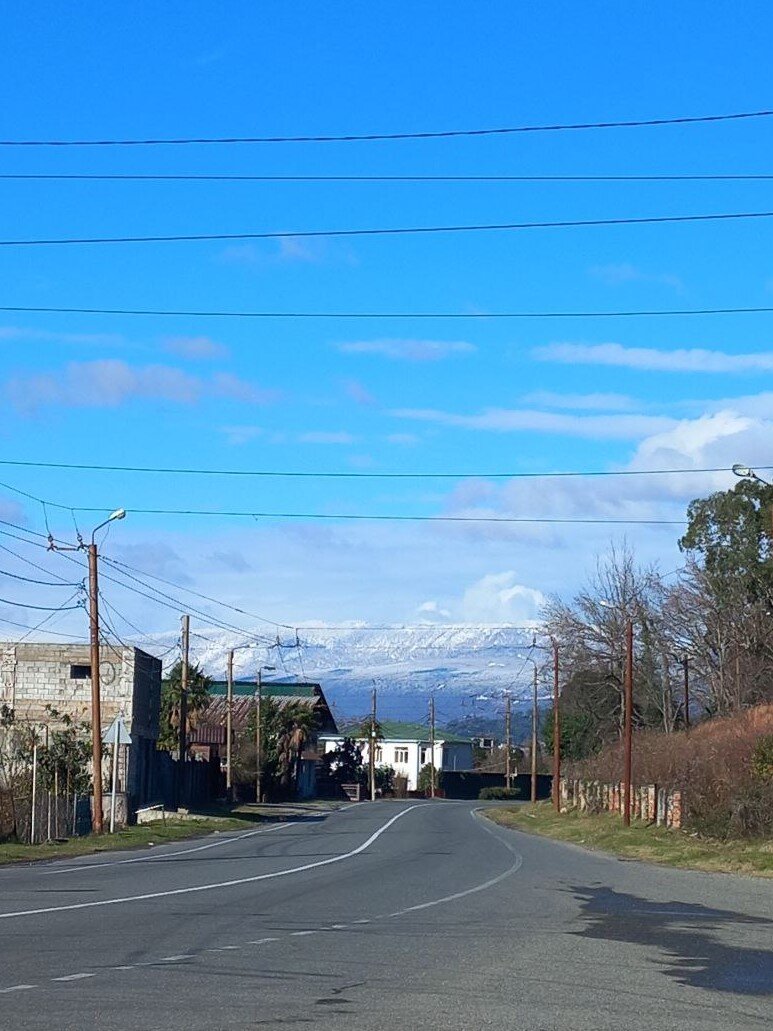 Об этом заброшенном саду рассказала одна местная женщина в автобусе, которая постоянно ходит туда собирать фрукты. Вот и мы собрались. Тем более, погода сегодня прямо с утра солнечная, самое то – прогулка на природе. Вышли на остановку, нам нужно было немного проехать в сторону Сухума, а там такой вид на горы открылся! Ночью выпал снежок, покрыл вершины, они стали ярко выделяться на фоне синего неба и такое впечатление, что приблизились. Мы доехали до остановки «Санаторий Айтар» и свернули в ущелье. Дорога хорошая, асфальтированная. Слева вскоре начался сад, но нас предупредили, что в начале за ним следят, обрабатывают. И действительно, там видны дорожки и даже стоит сторожевая вышка. Правда, уже, похоже, слишком ветхая, чтобы ею пользовались. Нам нужно было пройти подальше. Мы и пошли. Справа протекал ручей, а за ним заросший склон. Настолько заросший, что впечатление, будто перед тобой джунгли. Впечатление усиливалось тем, что среди лиственных деревьев стояли пальмы. Правда, в о