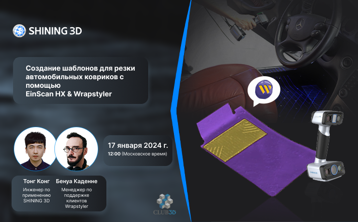Тема вебинара: Создание шаблонов для резки автомобильных ковриков с помощью EinScanHX и Wrapstyler. Компания CLUB3D рада пригласить вас на предстоящий онлайн-вебинар "Создание шаблонов для резки автомобильных ковриков с помощью EinScan HX и Wrapstyler", в котором примут участие Тонг Конг, инженер по применению SHINING 3D, и Бенуа Каденне, менеджер по поддержке клиентов Wrapstyler. В качестве инструментов на вебинаре использовались 3D-сканер EinScan HX и программное обеспечение Wrapstyler. EinScan HX - это ручной 3D-сканер с двойным освещением, оснащенный синим светодиодом и лазером для быстрого получения 3D-данных с объектов. Wrapstyler - это программное обеспечение для сглаживания 3D в 2D, разработанное компанией POLYQUARK. Оно позволяет создавать шаблоны для резки на основе 3D-объектов (отсканированных или созданных в САПР). ЗАРЕГЕСТРИРОВАТЬСЯ Примечание: при регистрации в поле «Company» укажите CLUB3D Содержание вебинара ● 3D-сканирование: Подробное описание процесса использования E