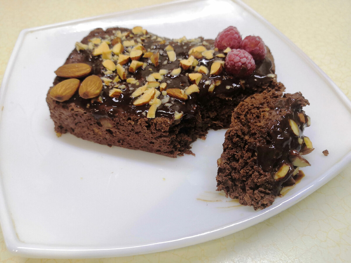 3. Выложила массу в форму и запекла в микроволновке 4 минуты (мощность моей 700). Приготовила глазурь: три квадратика горького шоколада и две столовые ложки молока нагрела в микроволновке (не кипятить) и размешала до однородности. Глазурь нанесла на кекс, украсила орехами и малиной.